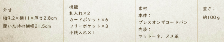 | ポケット | 札入れ×2/小銭入れ×1/カードポケット×6/フリーポケット×3 |