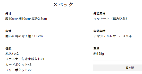 | ポケット | 札入れ×2/ファスナー付き小銭入れ×1/カードポケット×8/フリーポケット×2 |